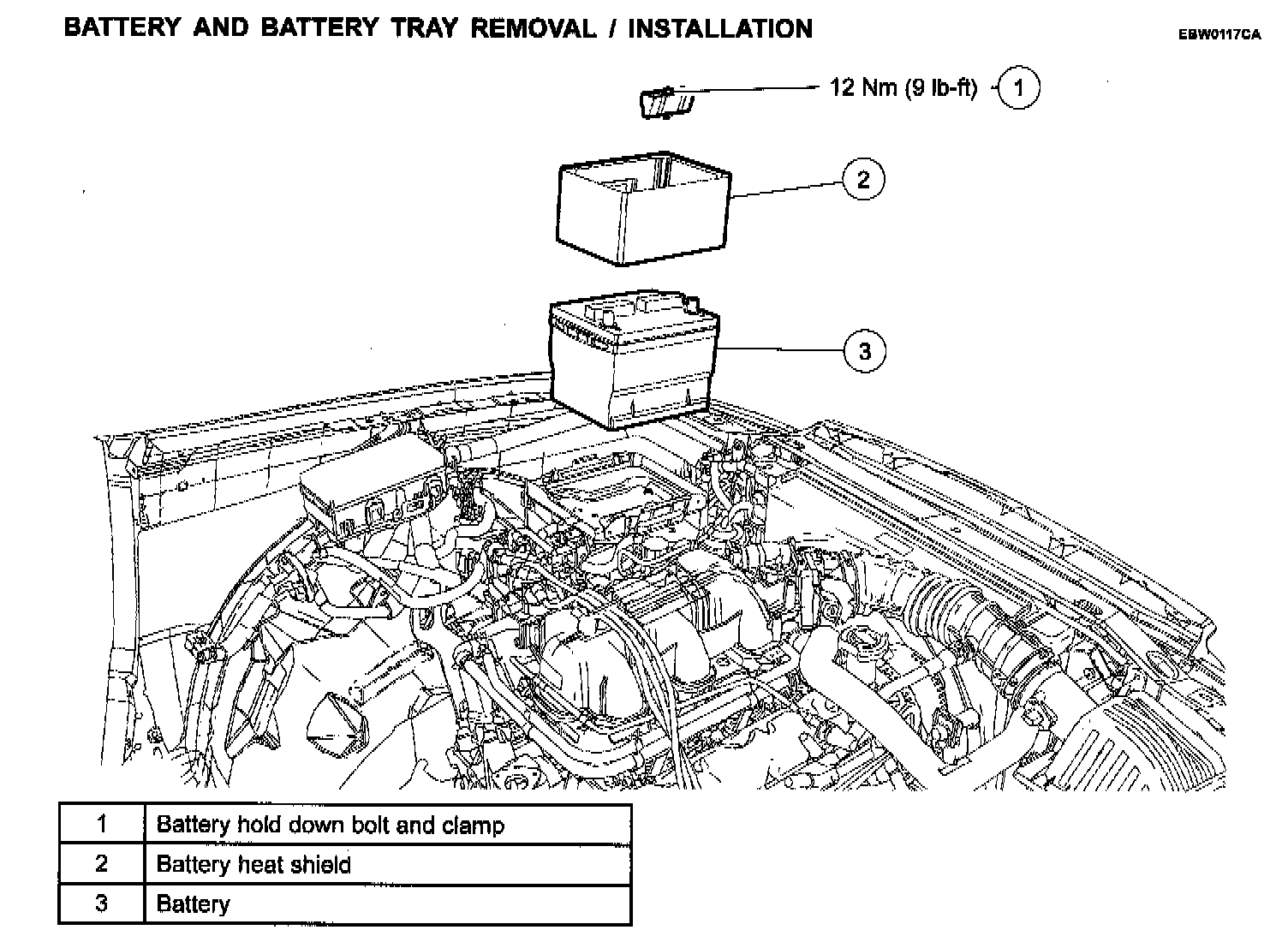 BATTERY AND BATTERY TRAY REMOVAL / INSTALLATIONWARNING: Batteries normally produce explosive gases which can cause personal injury. Therefore, do not allow flames, sparks or lighted substances to come near the battery. When charging or working near a battery, always shield your face and protect your eyes. Always provide ventilation. Failure to follow these instructions may result in personal injury.