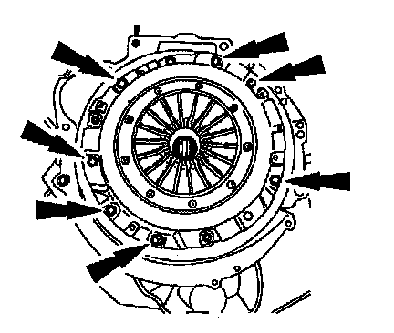 ^ If the clutch disc and clutch cover are to be reinstalled, remove the bolts evenly or permanent damage to the diaphragm spring will occur resulting in complete clutch release.