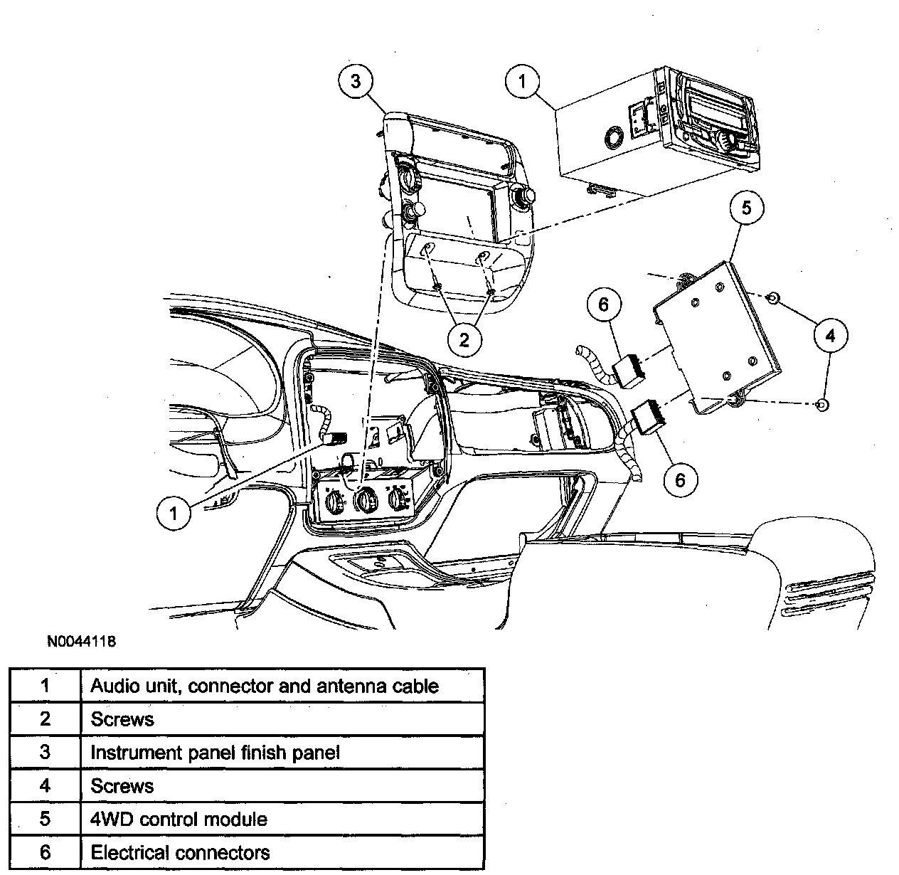 3. Disconnect the audio unit electrical connector(s) and antenna cable.