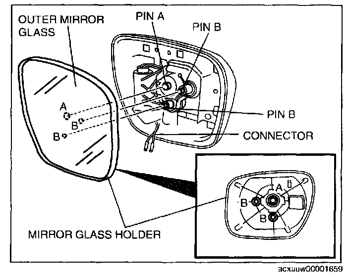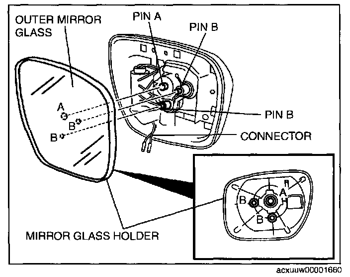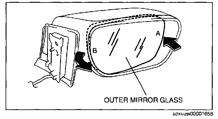 OUTER MIRROR GLASS REMOVAL1. Press area A of the mirror glass so that area B moves outward.