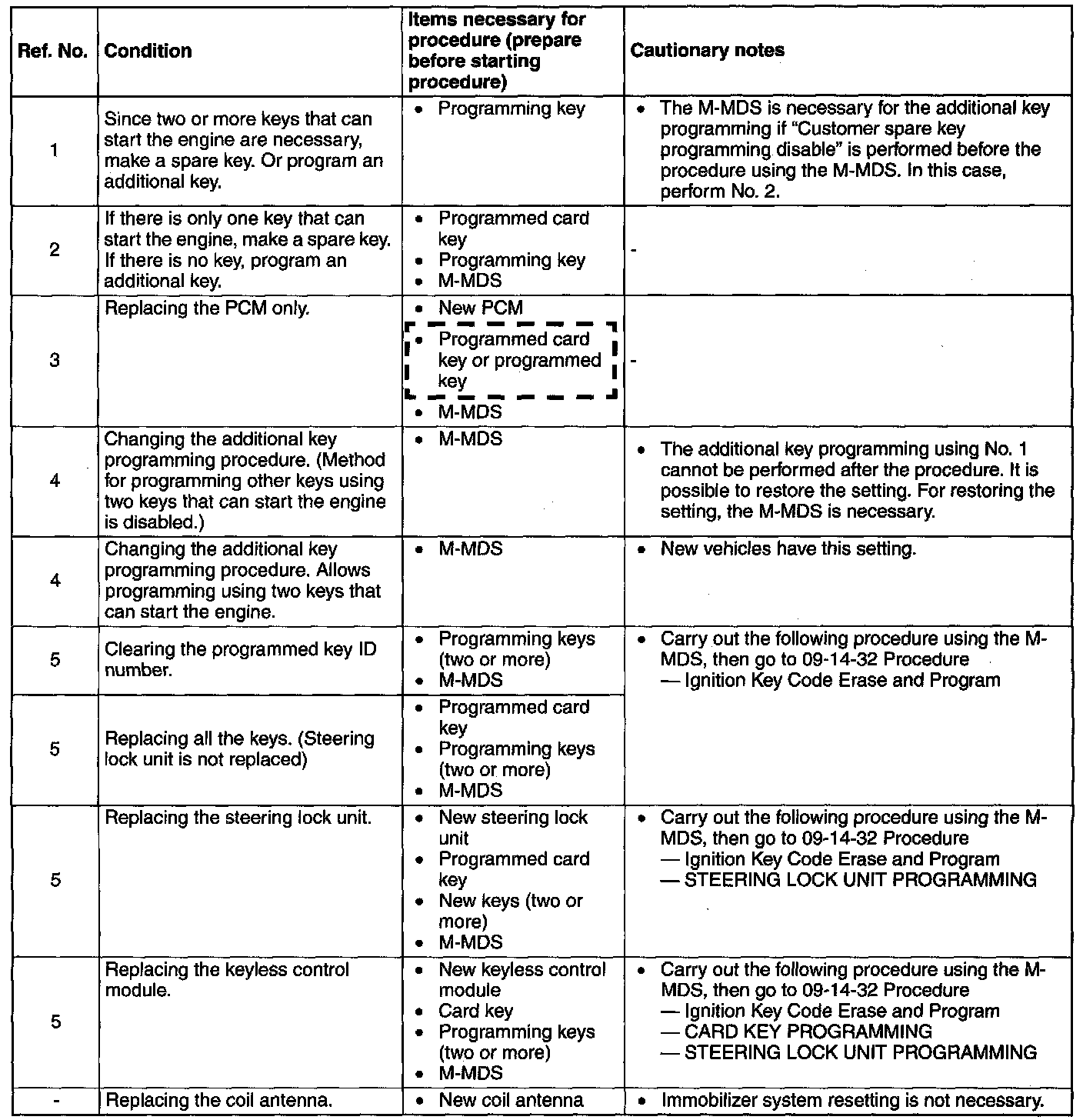 - When performing the following procedures, the immobilizer resetting procedure using the M-MDS' must also always be performed: "Keyless control module replacement", "PCM replacement", "Steering lock unit replacement", "Keyless control module and PCM joint replacement", "Keyless control module, PCM, and steering lock unit joint replacement", and "Key D number clearing". The engine will not start unless all work is performed using the M-MDS.