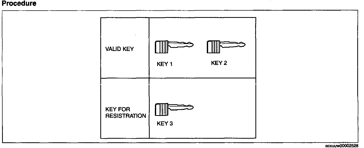 - If eight keys have already been programmed, and it is necessary to program other keys, the previously programmed key D numbers must first be cleared. To clear the key D number, refer to "No.1 Additional Key Programming Procedure (Using Two Valid Keys)".