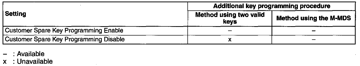 - If "No.1 Additional Key Programming Procedure (Using Two Valid Keys)" is set to disable, the additional key programming can be only performed using the M-MDS preventing the forging of a spare key by using two keys that can start the engine. This function is for use by rental car agencies or other companies with vehicle fleets.