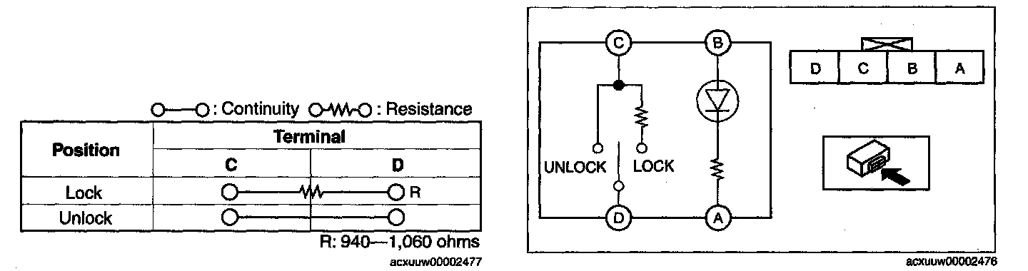 Inspect for continuity between the door lock switch terminals using an ohmmeter.