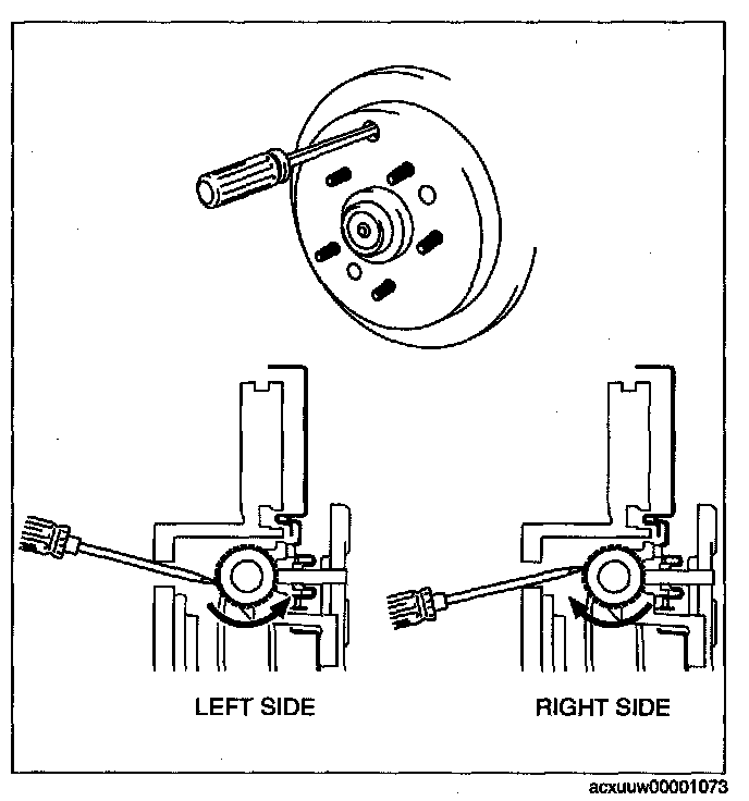 1) Insert a flathead screwdriver into the service hole and turn the adjuster in the direction of the arrow to expand the parking brake shoe until the disc plate cannot rotate.
