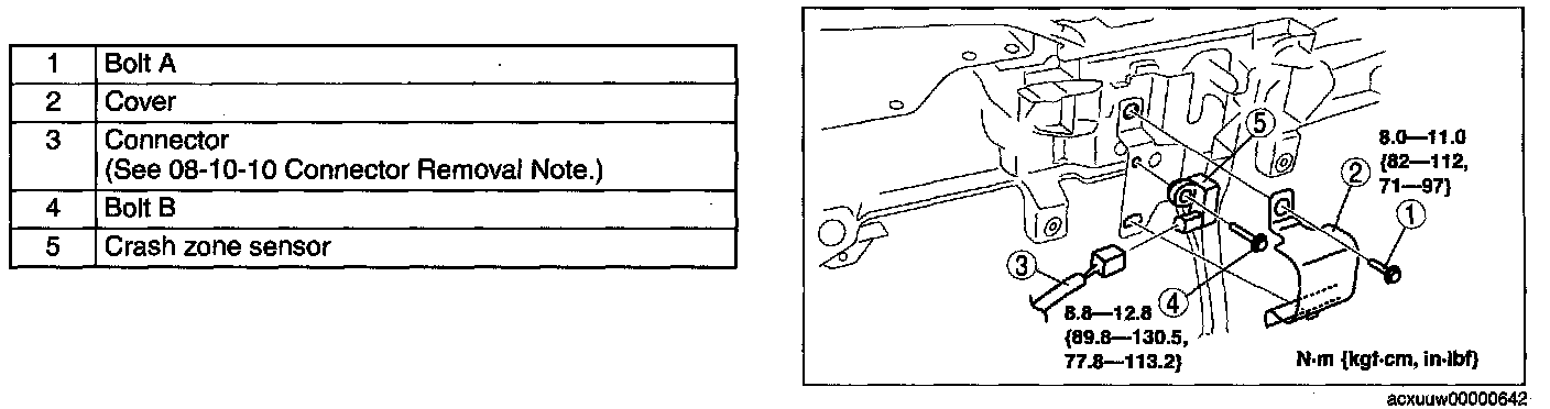 CRASH ZONE SENSOR REMOVAL/INSTALLATIONWARNING: Handling the crash zone sensor improperly can accidentally deploy the air bags and pre-tensioner seat belts, which may seriously injure you. Read the air bag system service warnings and cautions before handling the crash zone sensor. (See AIR BAG SYSTEM SERVICE WARNINGS.) (See AIR BAG SYSTEM SERVICE CAUTIONS.)