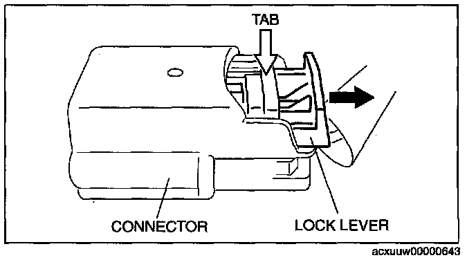 1. Disconnect the connector from the crash zone sensor by pressing the connector tab and pulling out the lock lever in the direction of the arrow.