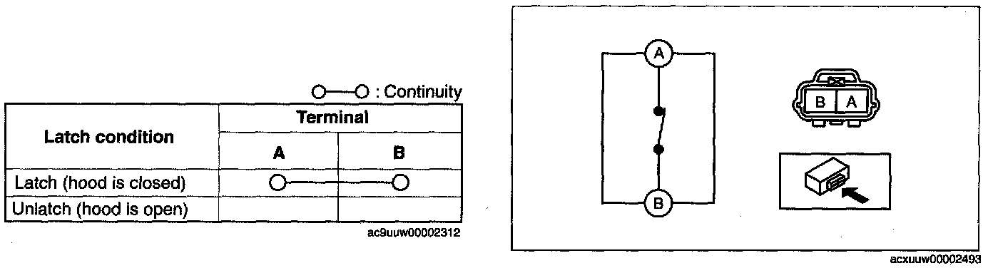 2. Inspect for continuity between the hood latch switch terminals.