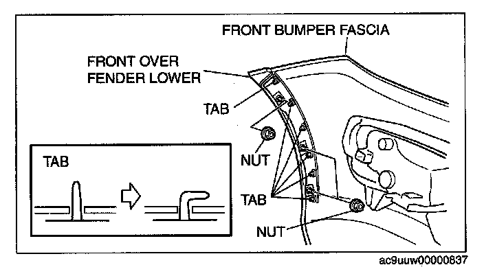 1. Attach the front over fender lower to the front bumper fascia with nuts.