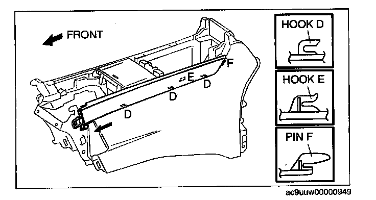 1. Slide the decoration plate towards the vehicle front as shown in the figure, then pull out the pin and hooks and remove the decoration plate.
