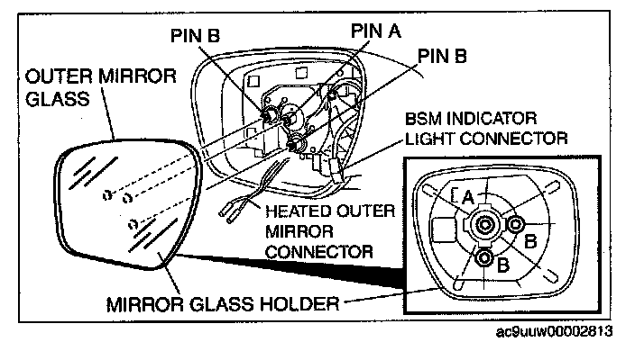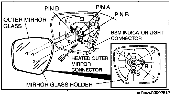 3. Pull the mirror glass holder and remove pins B.