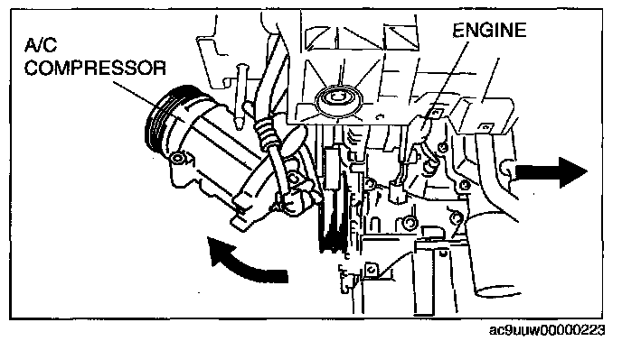 26. Remove the A/C compressor with the pipes connected and secure the A/C compressor using wire or rope so that it is out of the way.
