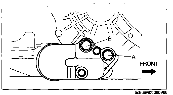 6. Tighten the bolts on the No.1 engine mounting bracket in the order of A, B.