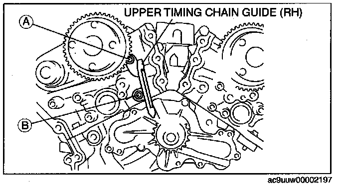 2. Remove the upper timing chain guide (RH) bolt B.