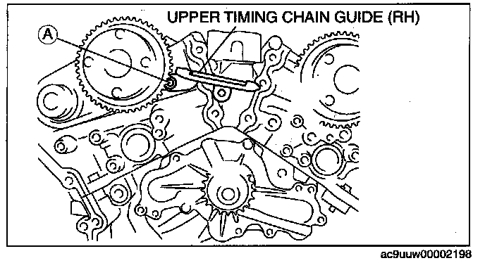 1. Loosen the upper timing chain guide (RH) bolt A.