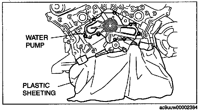 2. To prevent engine coolant from penetrating the oil pan, line the cylinder block with plastic sheeting as shown in the figure before removing the water pump.