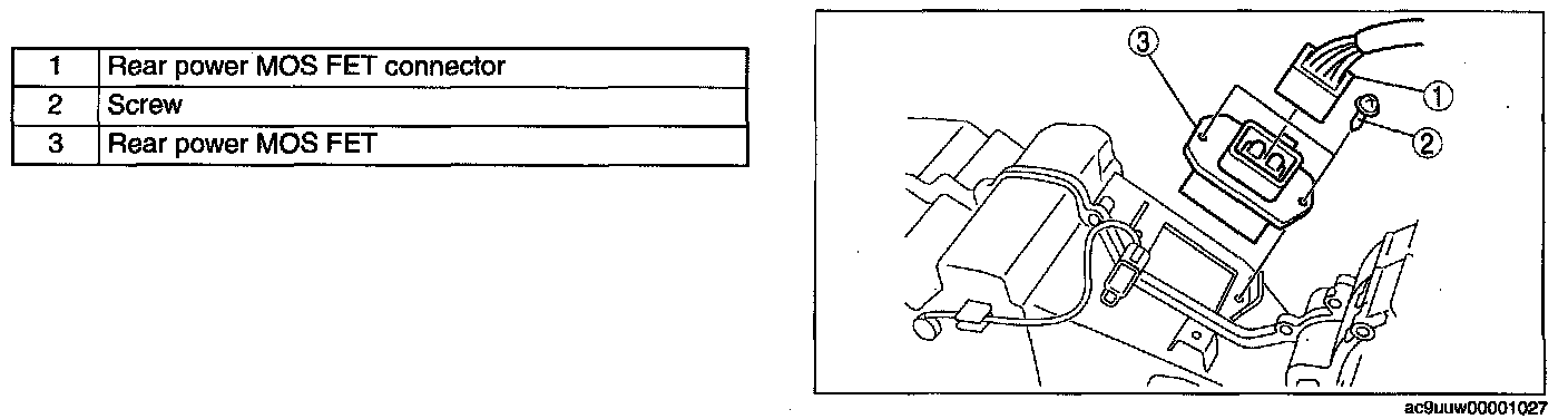 REAR POWER METAL OXIDE SEMICONDUCTOR FIELD EFFECT TRANSISTOR (POWER MOS FET) REMOVAL/INSTALLATION1. Disconnect the negative battery cable.