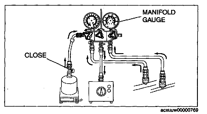 CAUTION: Close the manifold gauge valve immediately after stopping the vacuum pump. If the valve is left open, the vacuum pump oil will flow back into the refrigeration cycle and cause a decrease in the efficiency of the air conditioner.