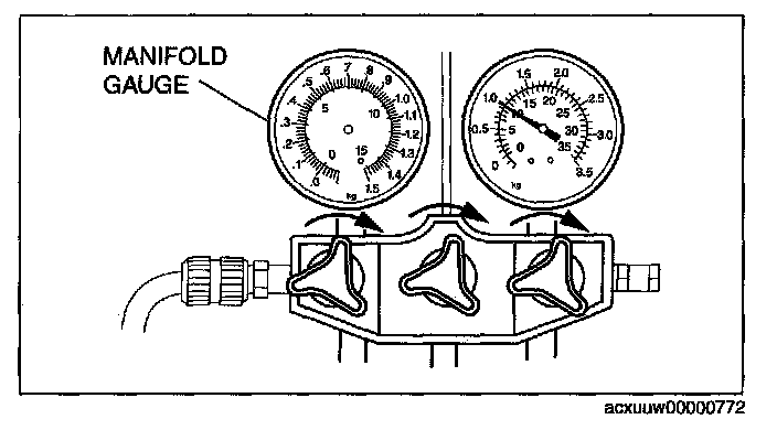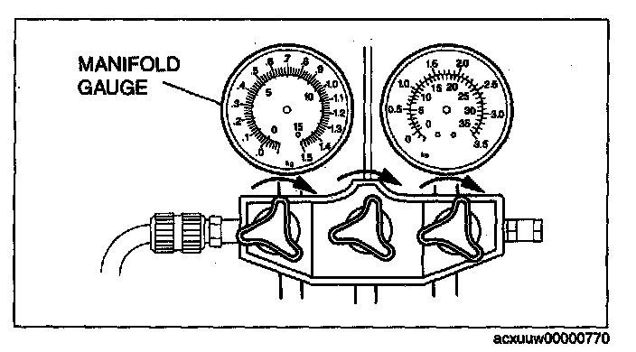 3. Verify that high- and low-pressure side readings of the manifold gauge are at -101 kPa {-760 mmHg, -29.9 inHg}. Close each valve of the manifold gauge.
