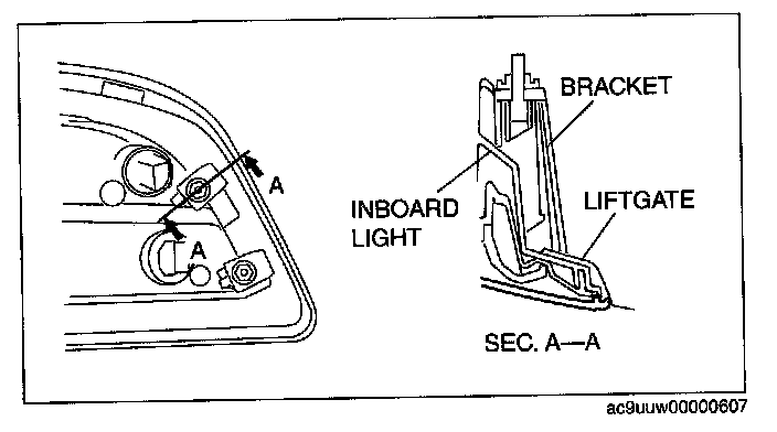 1. Insert the inboard light into the liftgate as shown in the figure, pivot it inward and then fix in place.