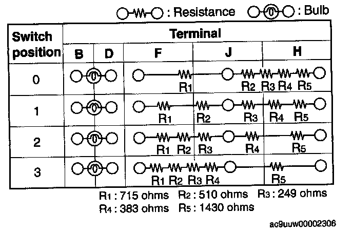 1. Verify that continuity between the headlight leveling switch terminals is as indicated in the table.