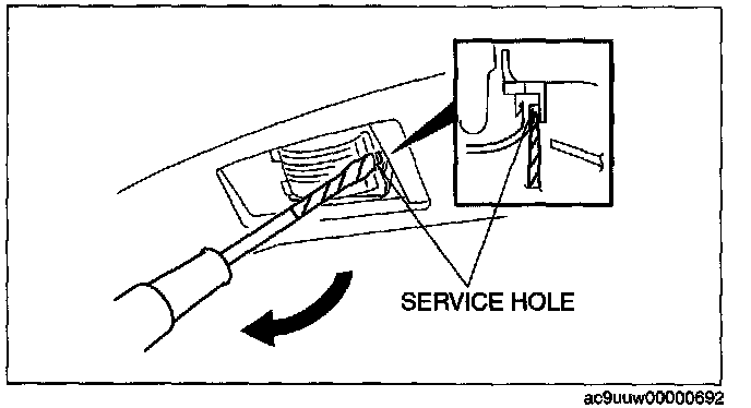 1. Insert a tape-wrapped flathead screwdriver into the service hole and pry with the screwdriver in the direction shown by the arrow to remove the lens.