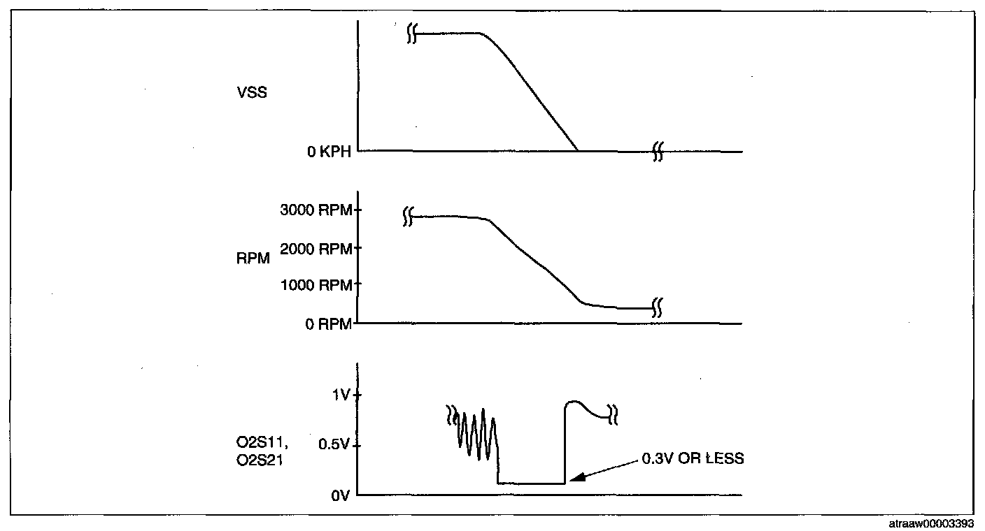 4. Verify that the front HO2S outputs a voltage of 0.6 V or more, one time or more, then verify that the front HO2S voltage (PID: O2S11, O2S21) is 0.3 V is or less while decelerating as shown in the figure.