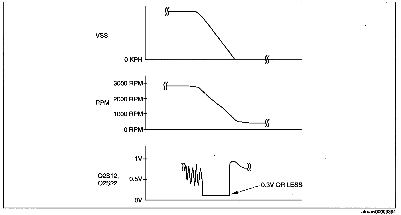 4. Verify that the rear H02S outputs a voltage of 0.6 V or more, one time or more, then verify that the rear HO2S voltage (PID: O2S12, O2S22) is 0.3 V is or less while decelerating as shown in the figure.