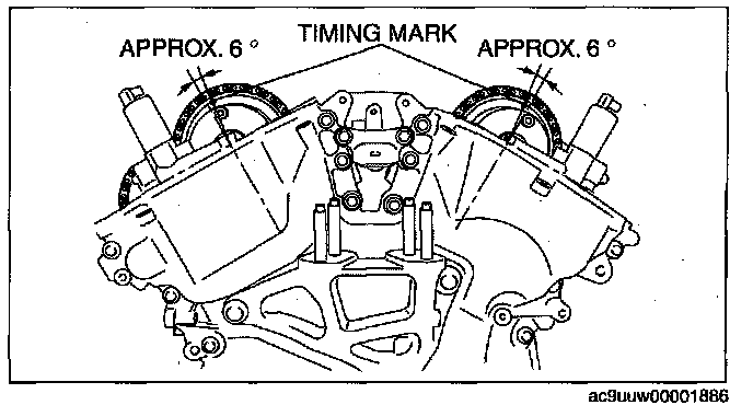 1) Rotate the crankshaft clockwise and verify that the timing mark of the intake side camshaft sprocket is in the position shown in the figure. In this position, the No.1 cylinder is at the TDC of the compression stroke.