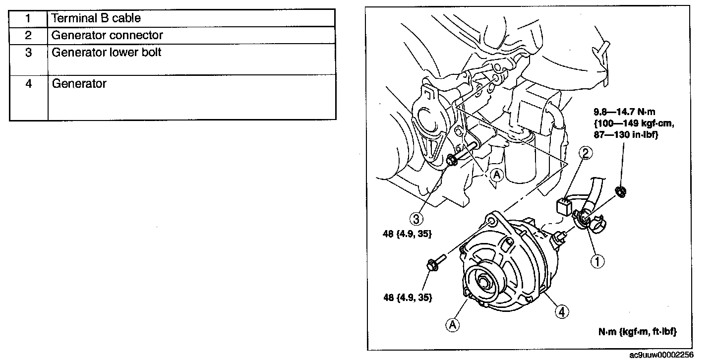 - When the battery cables are connected, touching the vehicle body with generator terminal B will generate sparks. This can cause personal injury, fire, and damage to the electrical components. Always disconnect the negative battery cable before performing the following operation.
