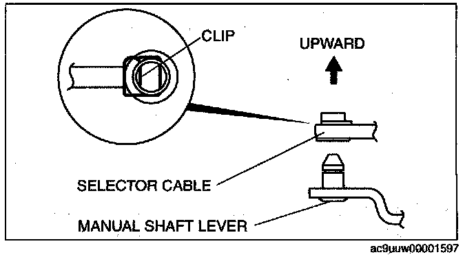 ^ Install the selector lever to the manual shaft lever with the clip side of the selector cable end facing up.