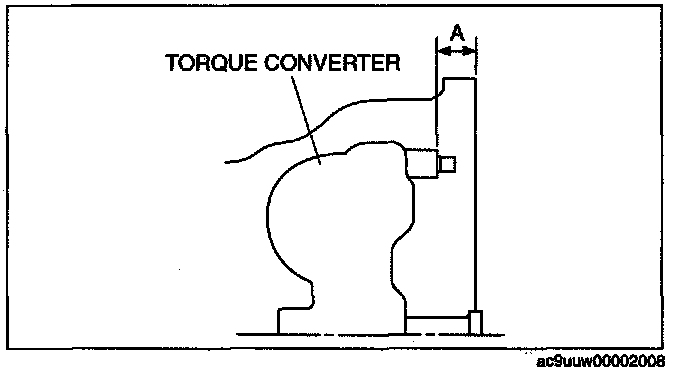 6. To ensure that the torque converter is installed accurately, measure distance A between the end of the torque converter and the end of the converter housing.