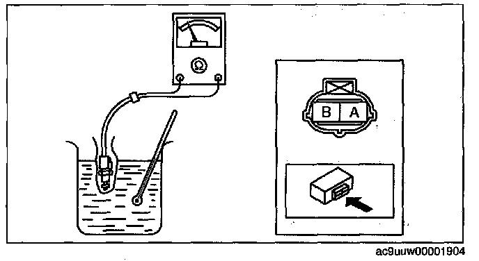 3. Wrap the differential oil temperature sensor with plastic wrap and immerse it into a beaker filled with water. Gradually raise the water temperature, and measure resistance between differential oil temperature sensor terminals A and B.