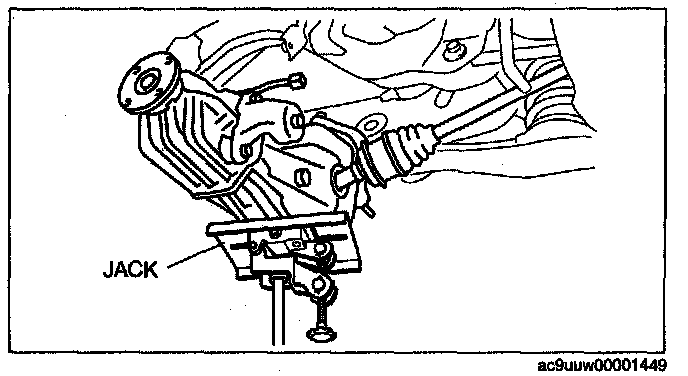 ^ When raising the rear differential, be careful not to damage the rear differential oil seal, rear drive shaft, and surrounding parts.