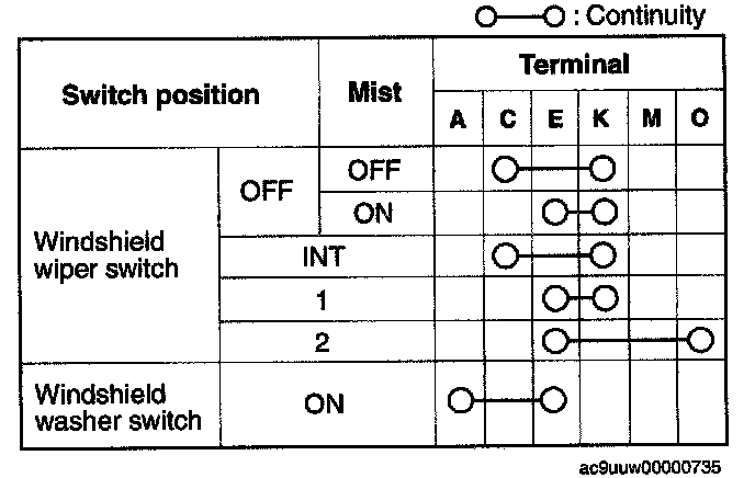 1. Verify that the continuity between the windshield wiper and washer switch is as indicated in the table.