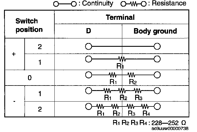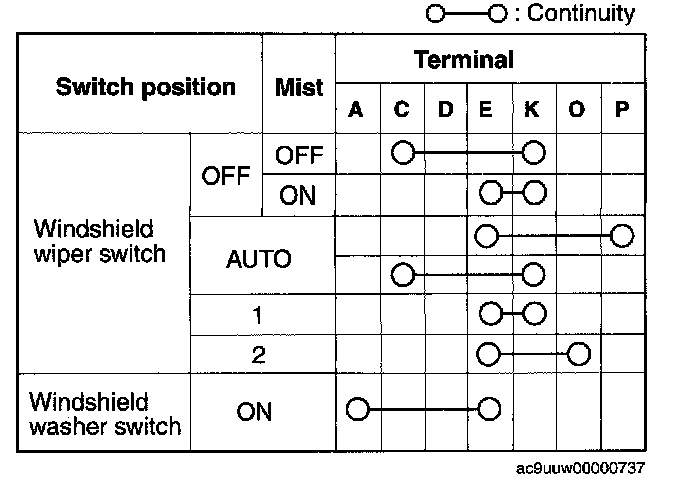 - Verify that the continuity between the windshield wiper and washer switch is as indicated in the table.