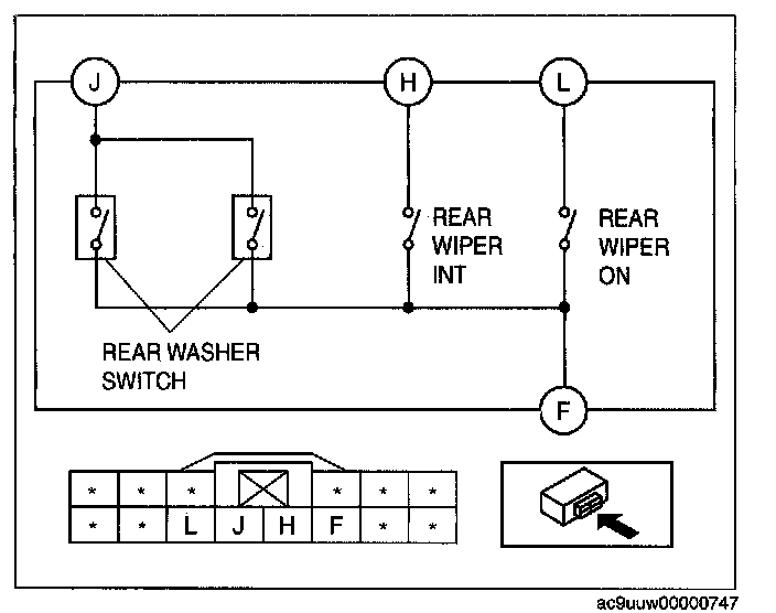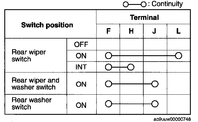 REAR WIPER AND WASHER SWITCH INSPECTION1. Verify that the continuity between the rear wiper and washer switch terminals is as indicated in the table.