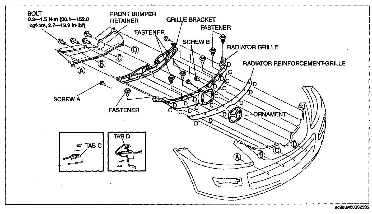 12. Press tabs C in the direction of the arrow, pull the radiator grille inward, and remove it from the front bumper.