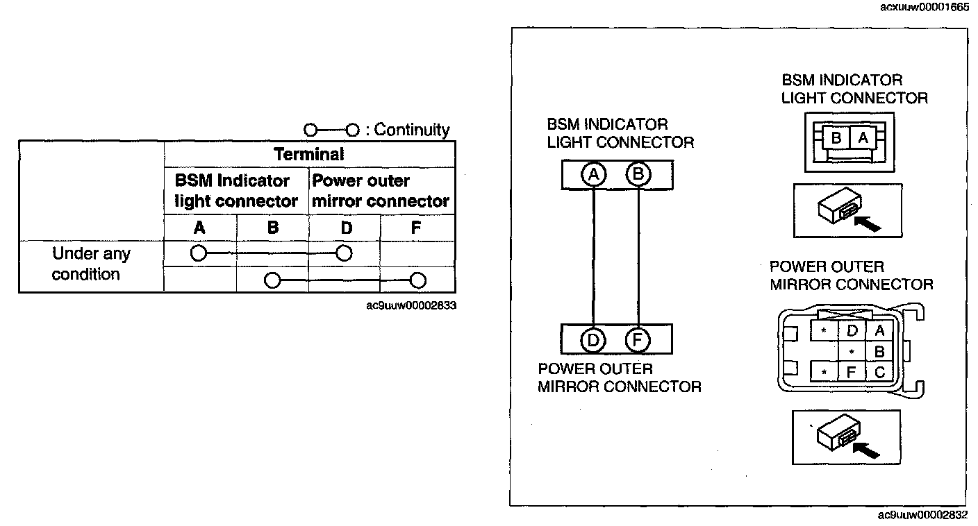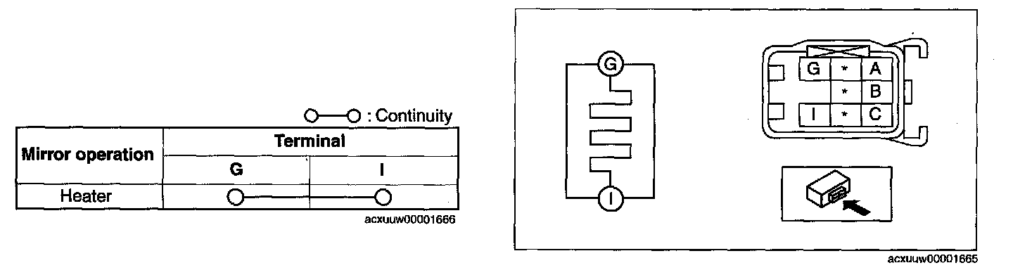 2. Inspect for continuity between the power outer mirror heater terminals.