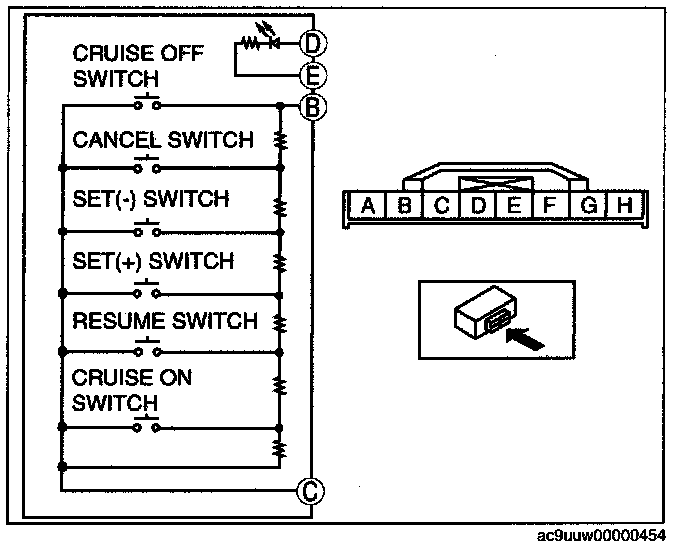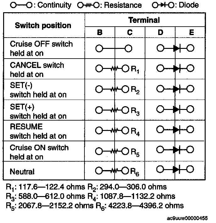 4. Inspect for resistance and continuity between the cruise control switch terminals using an ohmmeter.