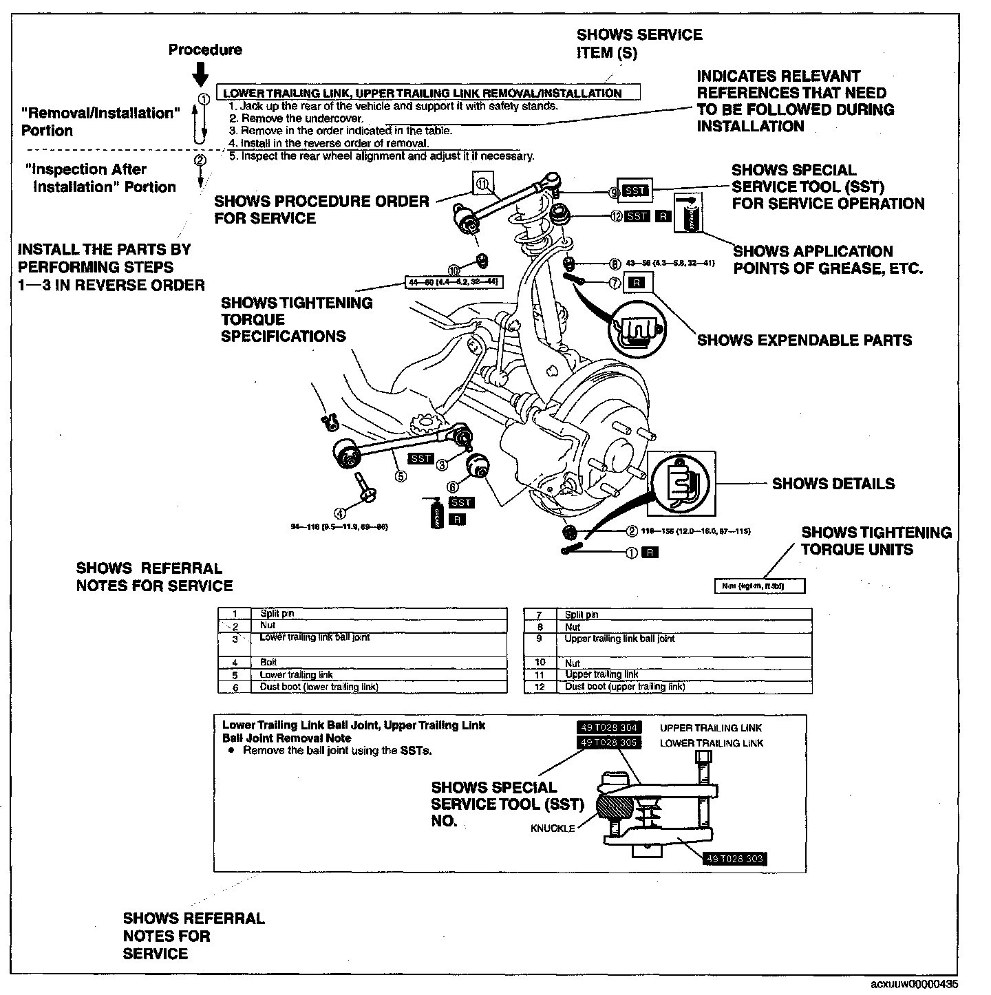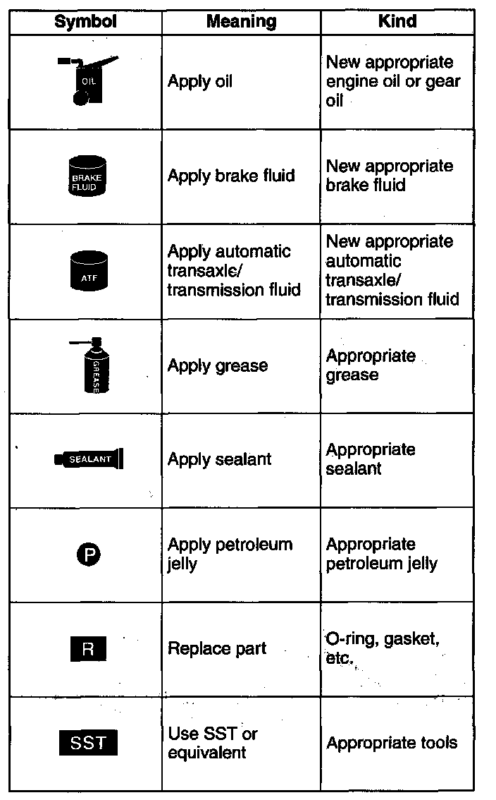 - There are eight symbols indicating oil, grease, fluids, sealant, and the use of SST or equivalent, use. These symbols show application points or use of these materials during service.
