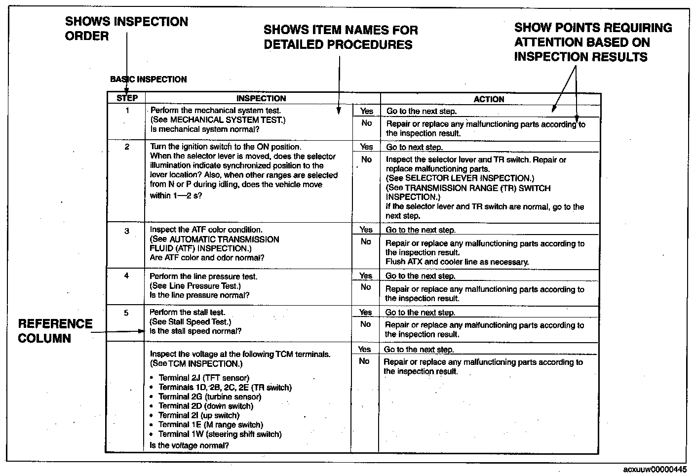 - Although inspections and adjustments are performed according to the reference column procedures, if the cause of the malfunction is discovered during basic inspection, continue the procedures as indicated in the action column.
