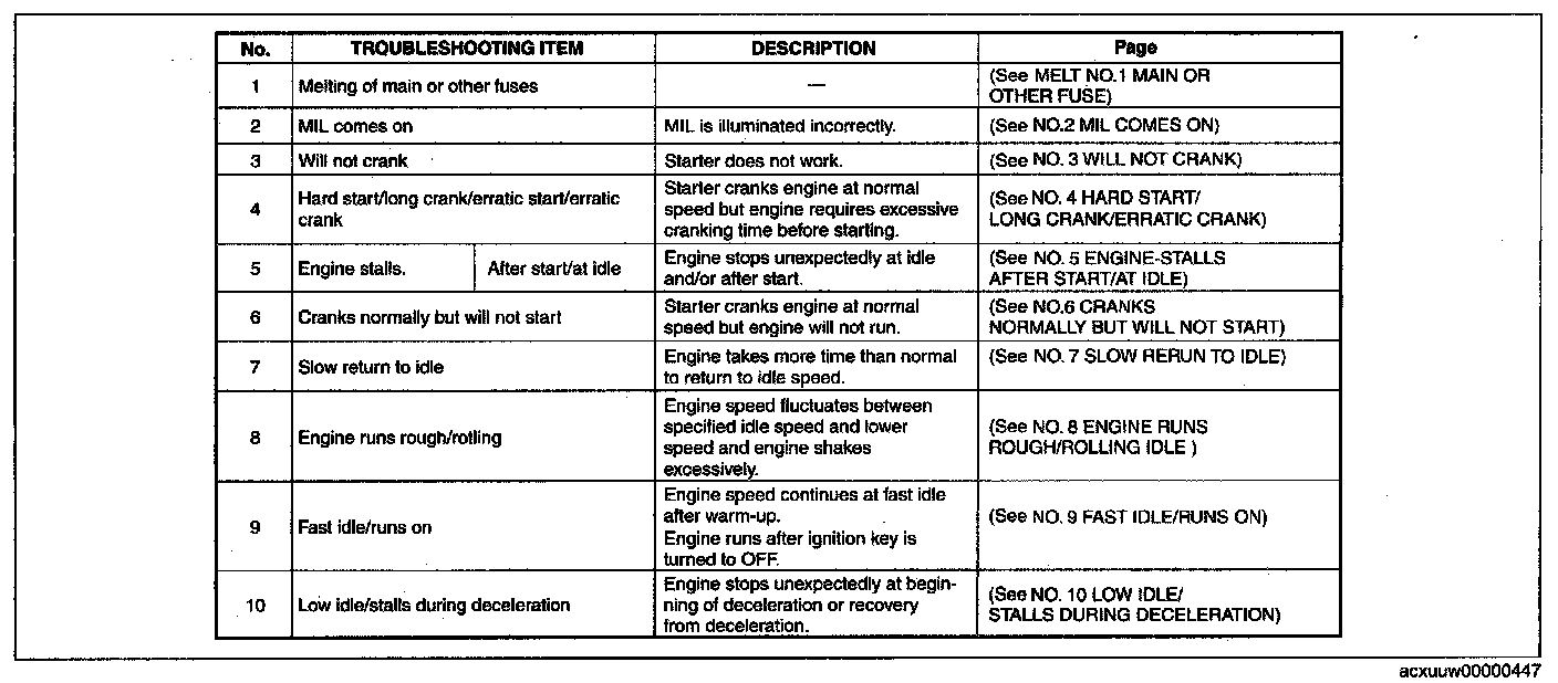- The quick diagnosis chart lists diagnosis and inspection procedures to be performed specifically relating to the cause of the malfunction.