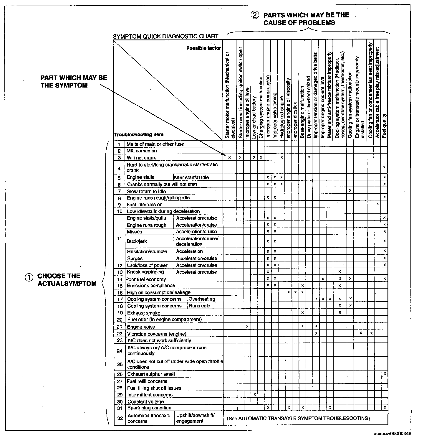 - The chart is effective in quickly narrowing down the relation between symptom and cause of the malfunction. It also specifies a range of common causes when multiple malfunction symptoms occur.