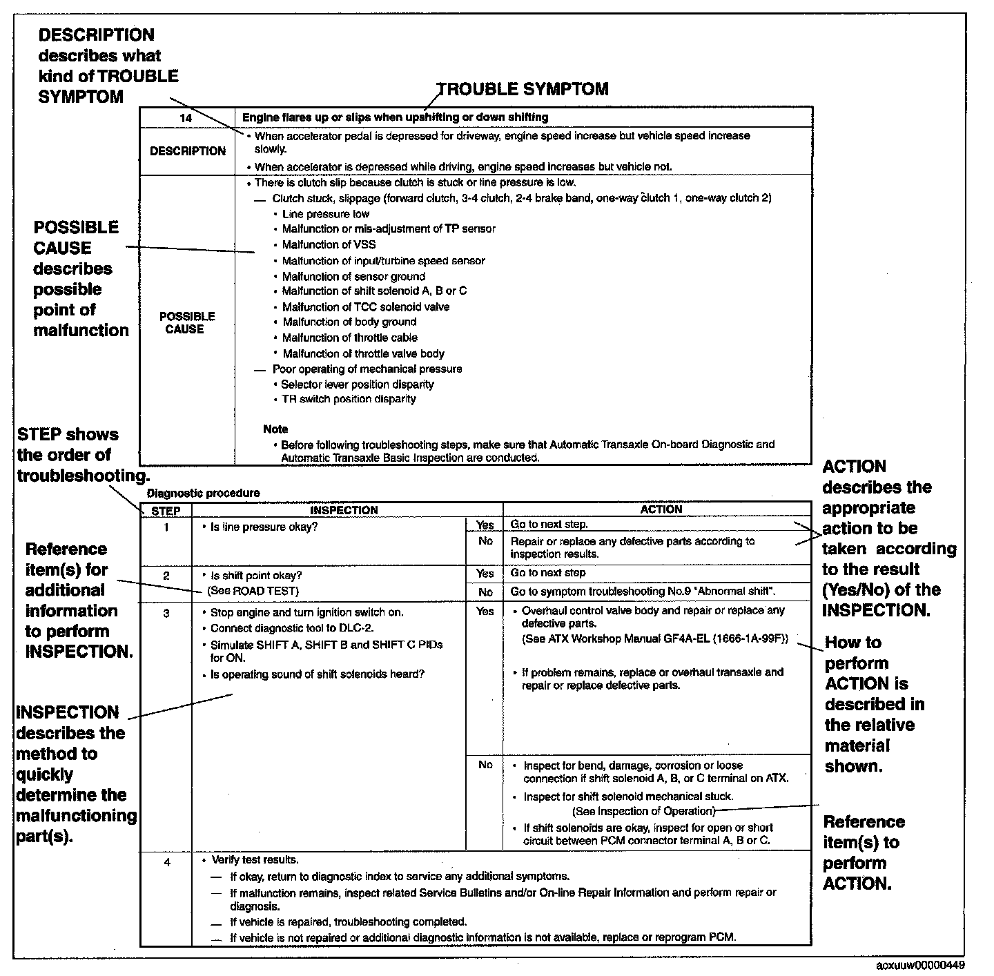 - Symptom troubleshooting shows diagnostic procedures, inspection methods, and proper action to be taken for each trouble symptom.