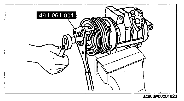 MAGNETIC CLUTCH DISASSEMBLY/ASSEMBLY1. Install the SST (49 LQ61 001) or a commercially available filter wrench as shown in the figure and remove the bolt.
