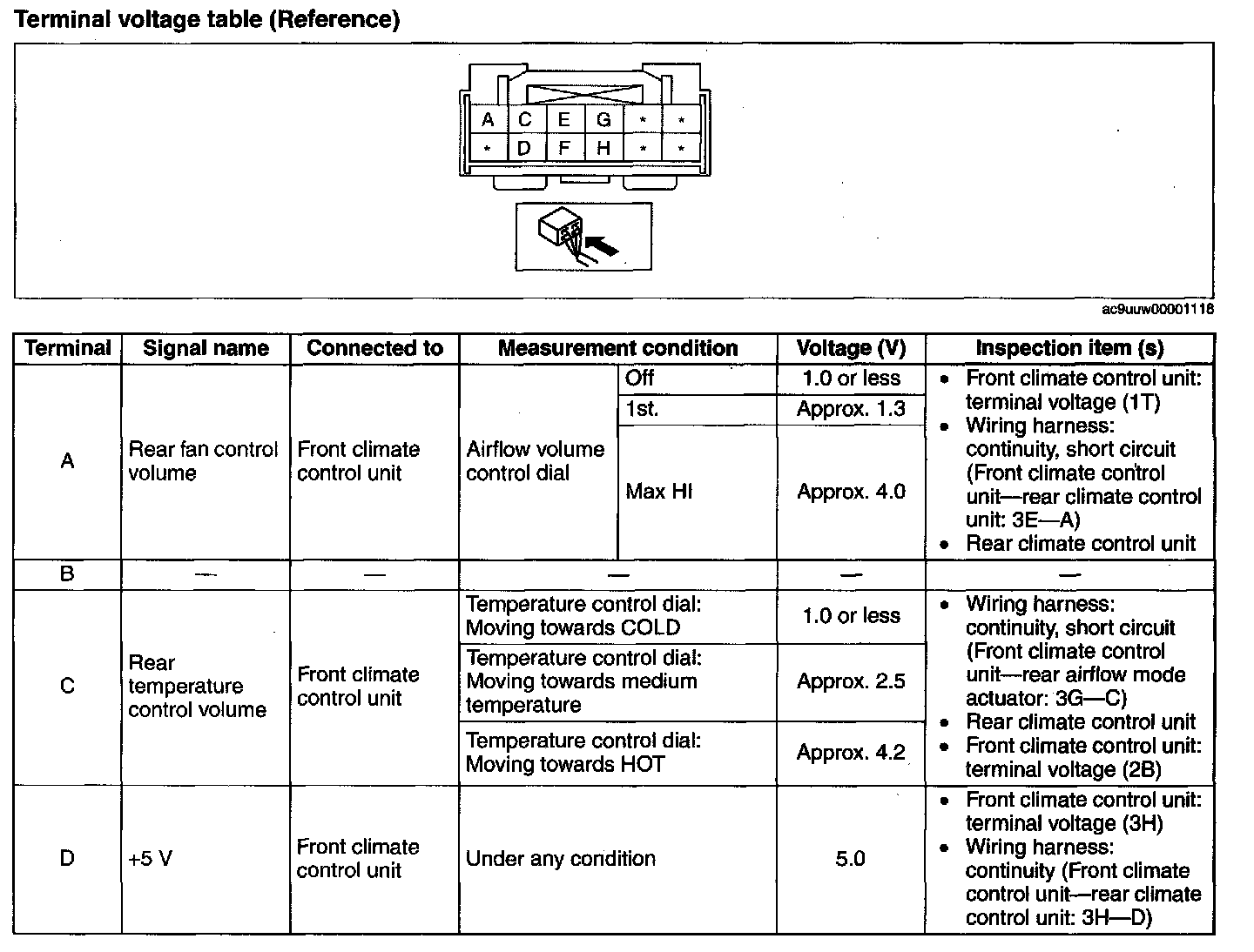 4. By inserting the positive (+) lead of the tester into each rear climate control unit terminal, measure the voltage according to the terminal voltage table .