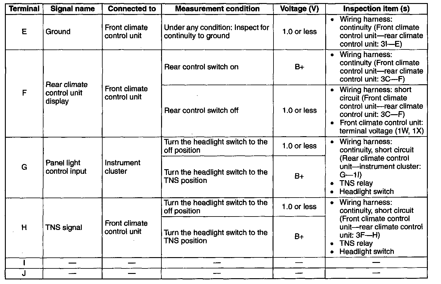 - If the parts under "Inspection item (s)" are found to be normal, replace the rear climate control unit.
