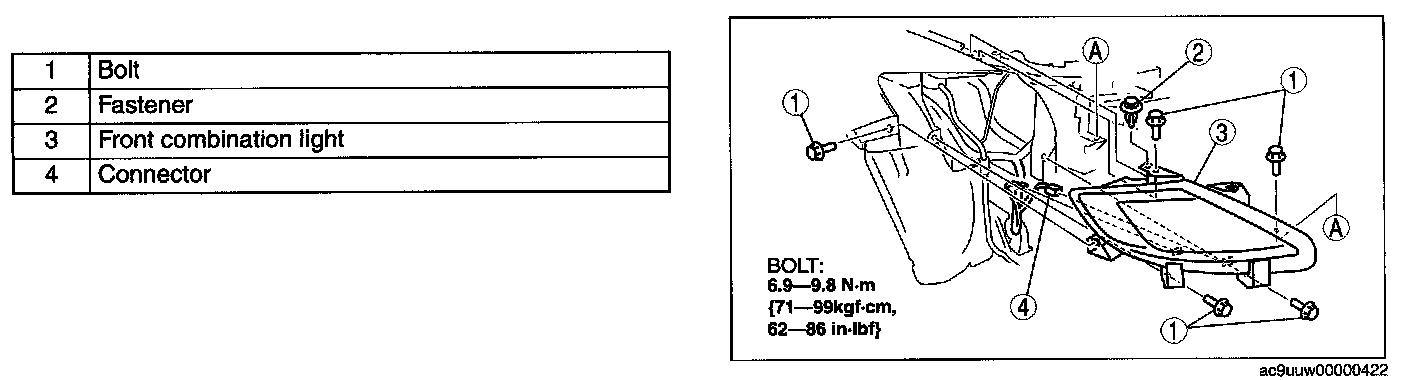 FRONT COMBINATION LIGHT REMOVAL/INSTALLATIONWARNING: Incorrect servicing of the discharge headlights could result in electrical shock. Before servicing the discharge headlights, always refer to the discharge headlight service warnings.