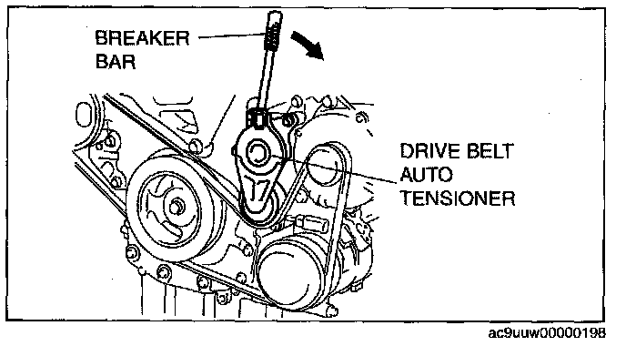 4. Set a breaker bar on the center of the tensioner pulley as shown.